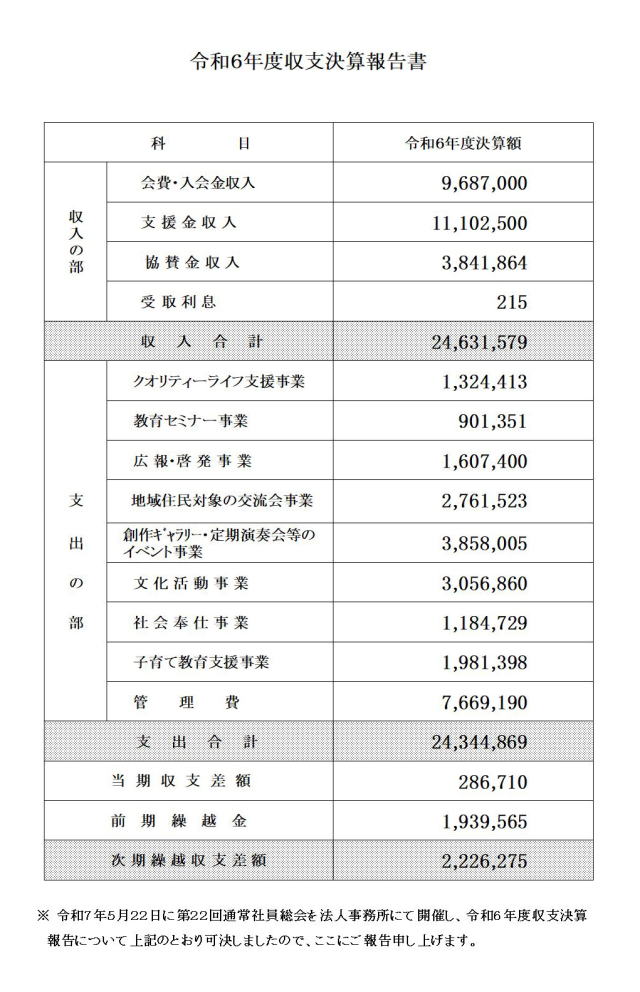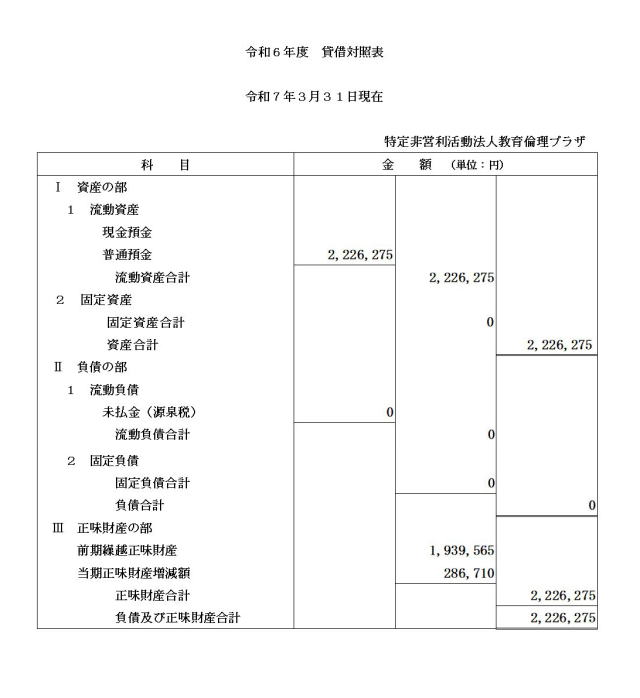 NPO法人教育倫理プラザの令和6年度の会計報告として、下記「貸借対照表」と「収支決算報告書」を、ホームページに掲示いたします。