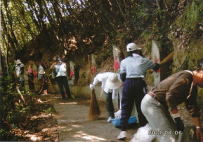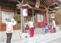 かつては地域にとって文化や教育の発信基地として人々が集い、参詣の絶えなかった神社や仏閣でも今までは人々から顧みられず忘れ去られたかのようなところが少なくありません。私たちはそのような神社や仏閣を対象に地域近隣の人々や氏子、檀家の方々にも呼びかけて清掃を行っています。そのことによってお寺やお宮の境内がきれいになるばかりでなく、多くの人と人との出会いを通して地域にとっての新しいコミュニティが生まれ、教育や文化を形成する土壌づくりにつながりつつあります。ちなみに清掃活動には、お年寄りから幼児まで参加していますが、幼い子どもたちが大人の人たちから生活の基本となる礼儀作法をはじめ、ほうき、くまで、雑巾といった清掃用具使い方、コミュニケーションのとり方を教えてもらうことを通して、子どもたち自身の成長にもつながっています。